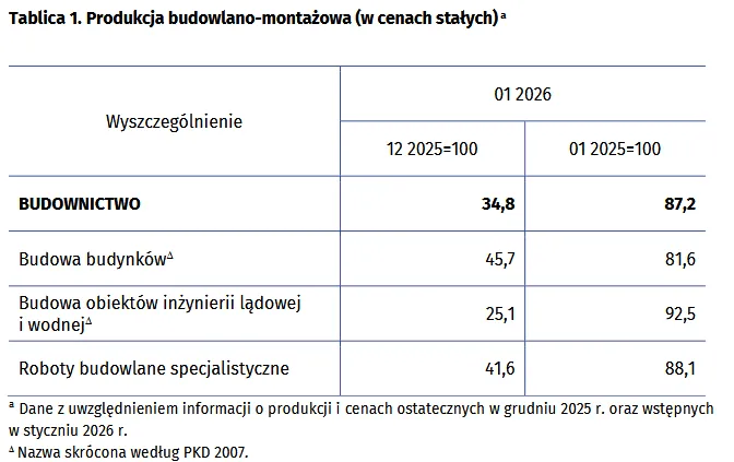 Według wstępnych danych produkcja budowlano-montażowa (…) w styczniu 2026 roku była niższa o 12,8 proc. w porównaniu z analogicznym okresem poprzedniego roku i o 65,2 proc. niższa w odniesieniu do grudnia 2025 roku – podał GUS.