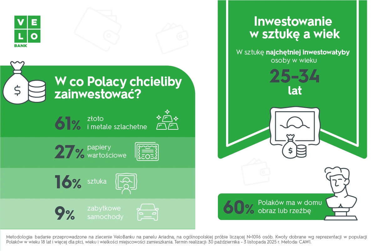 Badanie VeloBanku dowodzi, że Polacy przestają traktować sztukę tylko jako ozdobę, a widzą w niej odważną inwestycję. Choć cenimy złoto, to nowoczesna bankowość otwiera nam drzwi do świata unikalnych płócien i rzeźb.