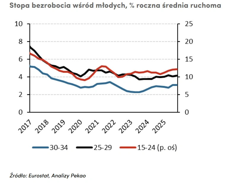 Niepokojąco wypadają dane o strukturze bezrobocia. Ekonomiści Pekao zwracają uwagę, że znacząca część wzrostu liczby bezrobotnych dotyczy osób młodych, które w przeciwieństwie do starszych grup nie zwiększały w tym czasie aktywności zawodowej.