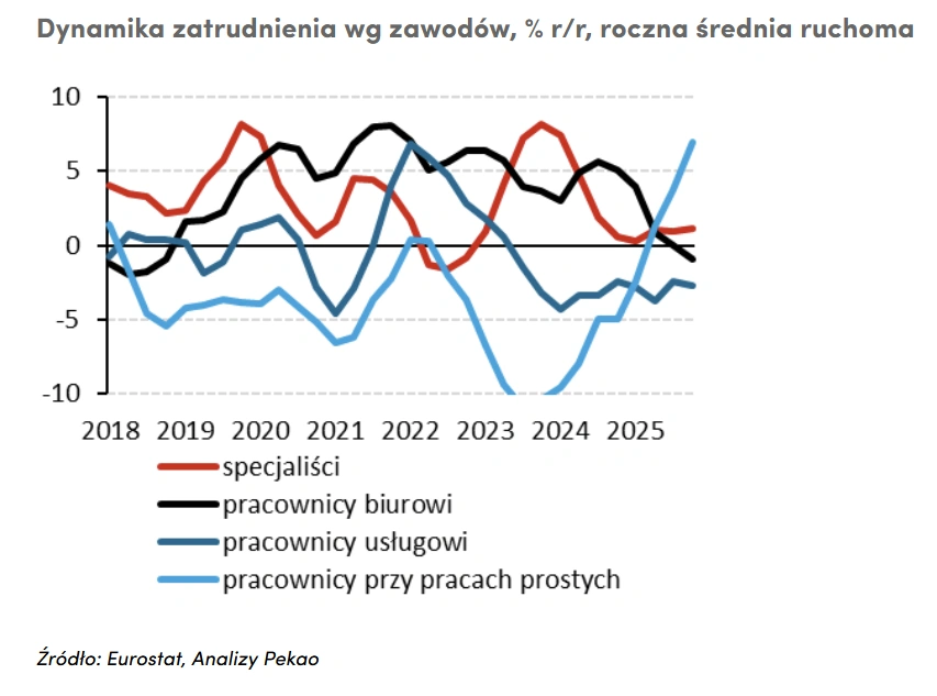 Jednocześnie dane pokazują, że ubywa części stanowisk biurowych i usługowych, a rośnie liczba prac prostych.