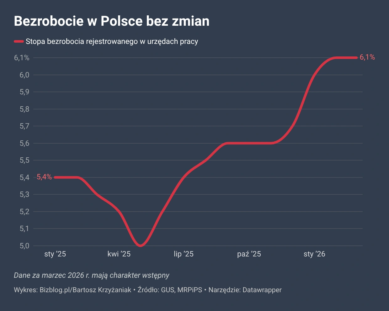 Opublikowane właśnie wstępne dane Ministerstwa Rodziny, Pracy i Polityki Społecznej mówią o prawie 951 tys. bezrobotnych zarejestrowanych w polskich urzędach pracy pod koniec marca 2026 r. Oznacza to, że stopa bezrobocia wyniosła w minionym miesiącu – podobnie jak w lutym – 6,1 proc. To wynik nieco gorszy od prognoz rynkowych zebranych przez PAP – te wskazywały na nieznaczny spadek wskaźnika w marcu – do 6 proc.