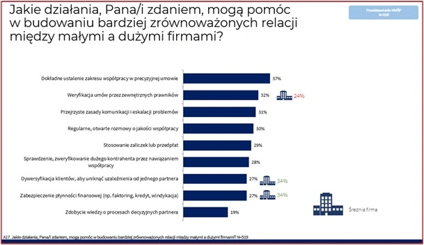 Dodatkowo jedna piąta jest zdania, że sposobem na równość we współpracy z dużą firmą jest zdobycie wiedzy o jej procesach decyzyjnych. Może to być jednak trudne na początku relacji, dlatego najpierw warto skoncentrować się na precyzyjnej umowie, odpowiednich zasadach komunikacji i zadbaniu o bezpieczeństwo finansowe.