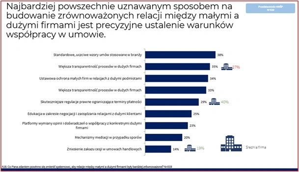 Relacje pomiędzy dużymi a małymi podmiotami poprawiłoby przyjęcie standardowych, uczciwych wzorów umów stosowanych w branży – wskazało na to 4 na 10 respondentów. Niemal jedna piąta średnich firm i 14 proc. wszystkich twierdzi, że istotnym, systemowym wsparciem byłoby zniesienie zakazu cesji w umowach.