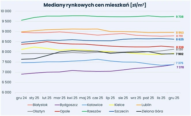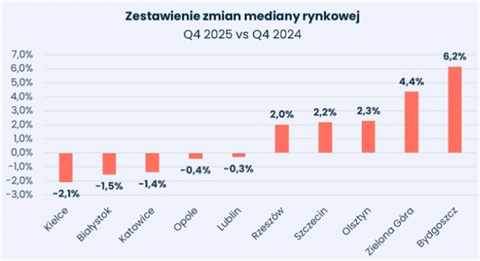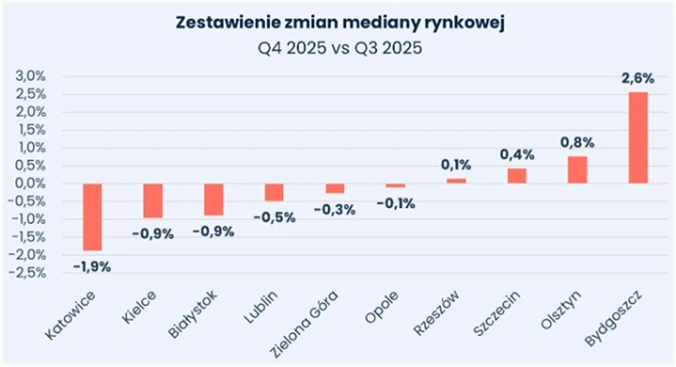 Analiza danych dla miast regionalnych pokazuje, że także tam IV kwartał 2025 roku nie przyniósł istotnych zmian cenowych. Największy spadek mediany odnotowano w Katowicach (-1,9 proc.). Mniejsze obniżki pojawiły się w Kielcach i Białymstoku (po-0,9 proc.) oraz w Lublinie (-0,5 proc.). W Zielonej Górze i obniżki miały charakter kosmetyczny.