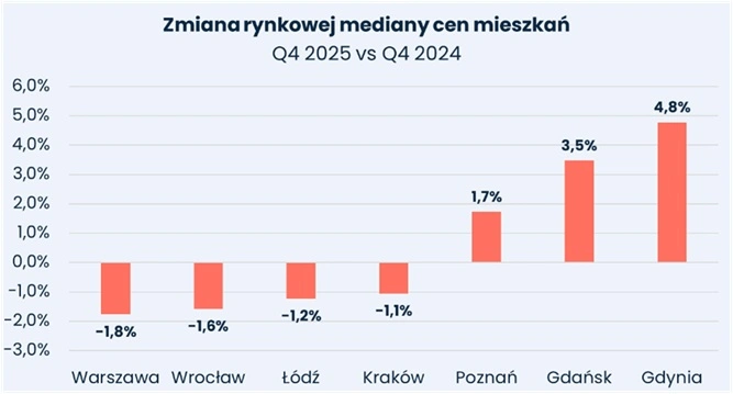 Według eksperta większe różnice widoczne są w ujęciu rocznym. Porównanie IV kwartału 2025 roku z analogicznym okresem 2024 roku pokazuje, że spadki cen w największych miastach miały umiarkowaną skalę.