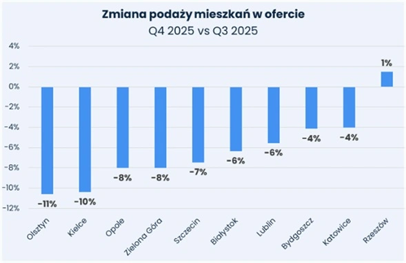 Zbliżona dynamika była widoczna również na rynkach regionalnych, gdzie w IV kwartale 2025 roku podaż mieszkań w większości miast zmniejszyła się względem poprzedniego kwartału. Skala spadków była jednak wyraźnie zróżnicowana.