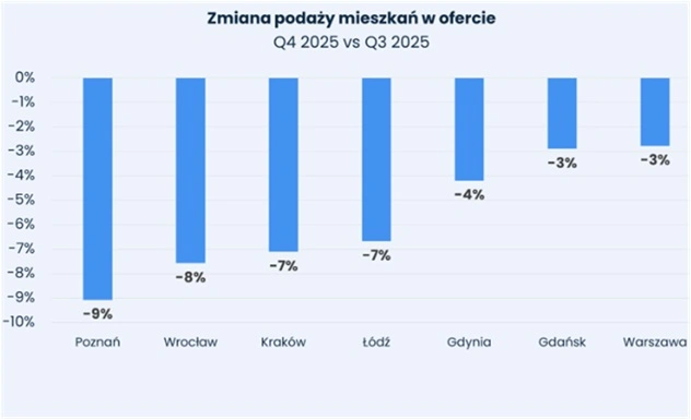 Najsilniejsze ograniczenie podaży wystąpiło w Poznaniu i Wrocławiu, gdzie liczba ofert spadła odpowiednio o około 9 proc. i 8 proc., a także w Krakowie i Łodzi o około 7 proc. Trójmiasto wypada na tym tle relatywnie stabilnie: w Gdyni liczba ofert obniżyła się o około 4 proc., a w Gdańsku o około 3 proc. Podobną skalę spadku odnotowano w Warszawie.
