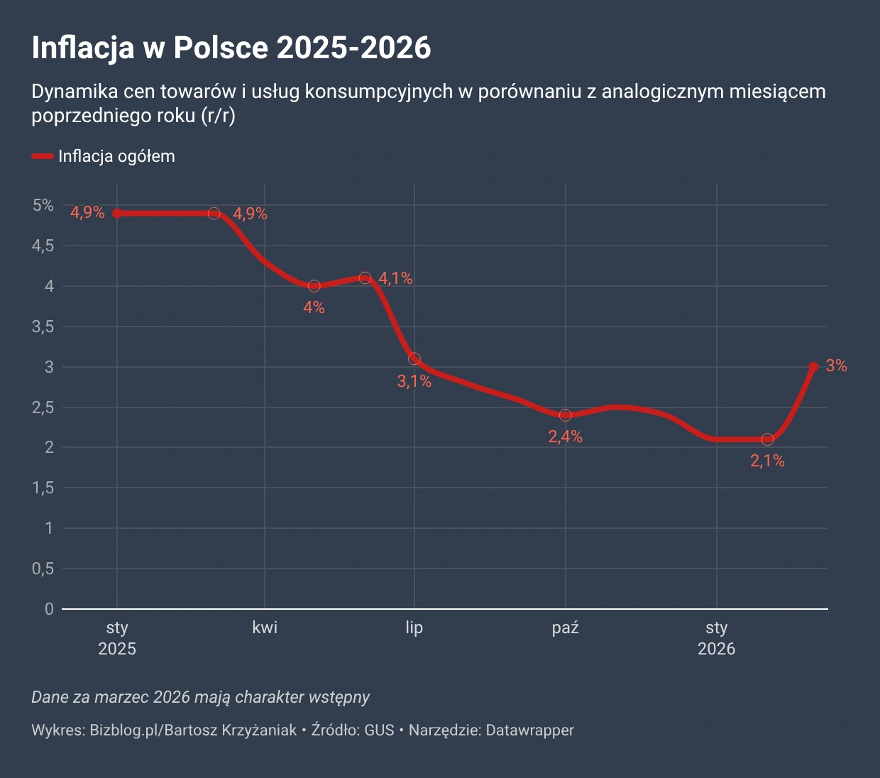 Szybki szacunek marcowej inflacji, opublikowany we wtorek przez Główny Urząd Statystyczny, pokazuje skok rocznego wskaźnika CPI z 2,1 proc. w lutym do 3 proc. W ciągu miesiąca ceny towarów i usług wzrosły o 1 proc. Wyniki okazały się nieco lepsze od prognoz analityków, które wskazywały na wzrost inflacji do ok. 3,2-3,3 proc.