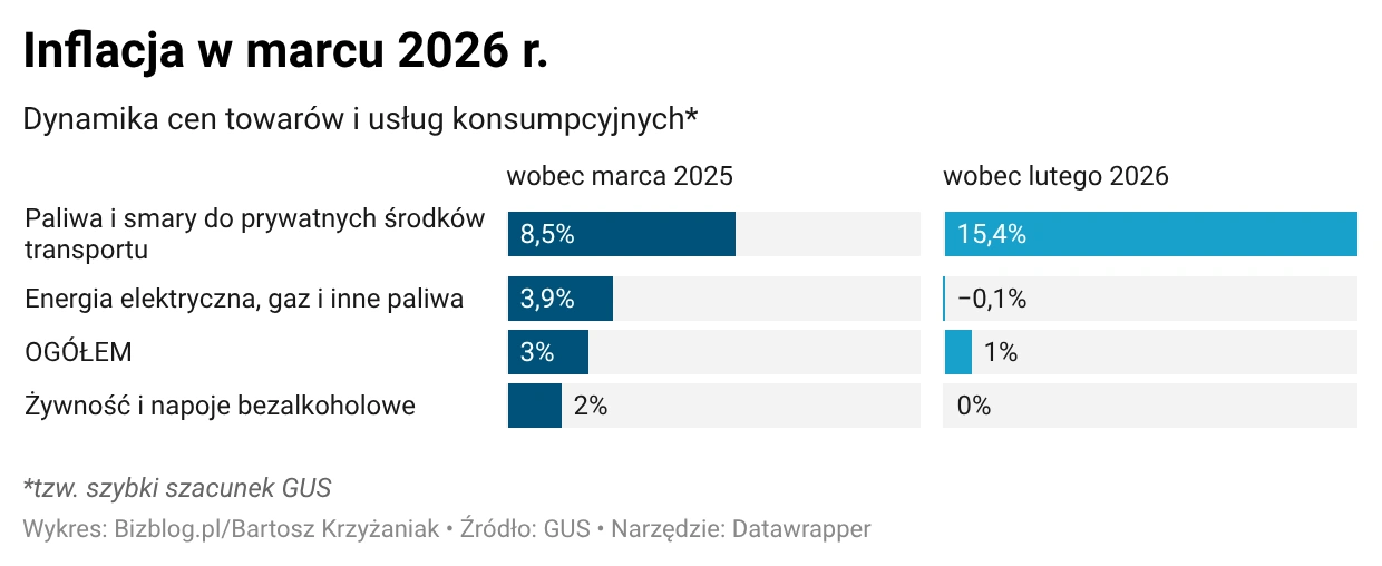 Gwałtowne przyspieszenie inflacji w marcu, jak zauważa Monika Kurtek, główna ekonomistka Banku Pocztowego, wynika z jednego powodu – wojny pomiędzy USA i Izraelem a Iranem. Drastyczny spadek podaży ropy naftowej i gazu, a tym samym wzrost ich cen, natychmiast spowodował wzrost cen paliw na stacjach – wg szacunków GUS wyniósł on 15,4 proc. w stosunku do lutego. I to właśnie drożejące paliwa, jak zauważają ekonomiści ING, niemal w całości odpowiadają za marcowy wzrost inflacji.