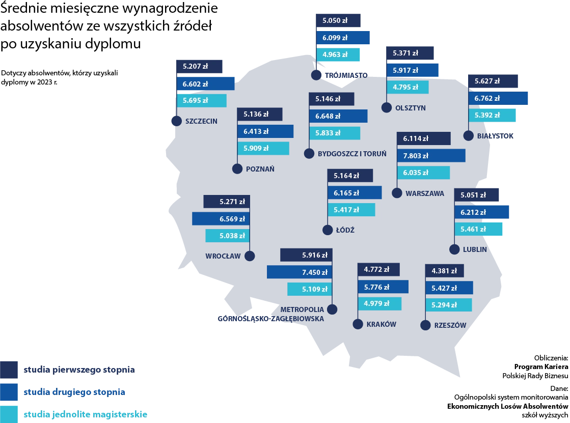 Nie jest zaskoczeniem, że najwyższe zarobki uzyskali absolwenci w Warszawie (6750,95 zł brutto). Dalej plasują się ci, którzy ukończyli uczelnie w aglomeracji górnośląsko-zagłębiowskiej (6 343,84 zł) i Białymstoku (6 016,27 zł). Na drugim biegunie znalazł się Rzeszów, w stolicy Podkarpacia absolwenci mogą liczyć jedynie na 4 958,44 zł miesięcznej pensji.