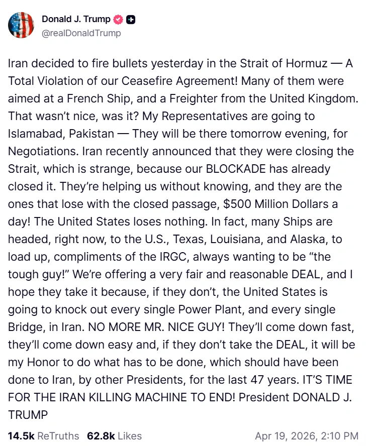 Sugerowały to wypowiedzi polityków z jednej i drugiej strony konfliktu. Cieśnina Ormuz miała być otwarta, wkrótce do drugiej rundy pokojowych rokowań – powtórnie w stolicy Pakistanu – usiąść mieli przedstawiciele obu stron. Prezydent USA i jego ludzie zapewniali, że rozmowy ze stroną irańską „idą bardzo dobrze”.