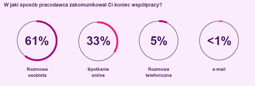 Nowością w praktykach pracodawców są zwolnienia przeprowadzane zdalne. Pojawiły się, jak przypomina Maciej Walkowiak, kilka lat temu wraz z pandemią Covid-19, ale wraz z nią nie odeszły. I nie są to dziś zdarzenia incydentalne, szczególnie w sytuacji, gdy coraz więcej firm realizuje lub zapowiada zwolnienia grupowe. Z ostatniego raportu LHH wynika, że aż jedna trzecia rozmów rozstaniowych odbywa się online. Z co dwudziestym zwalnianym pracodawca rozstaje się telefonicznie. Sporadycznie zdarzają się sytuacje, w których firma informuje o zwolnieniu przez e-maila.