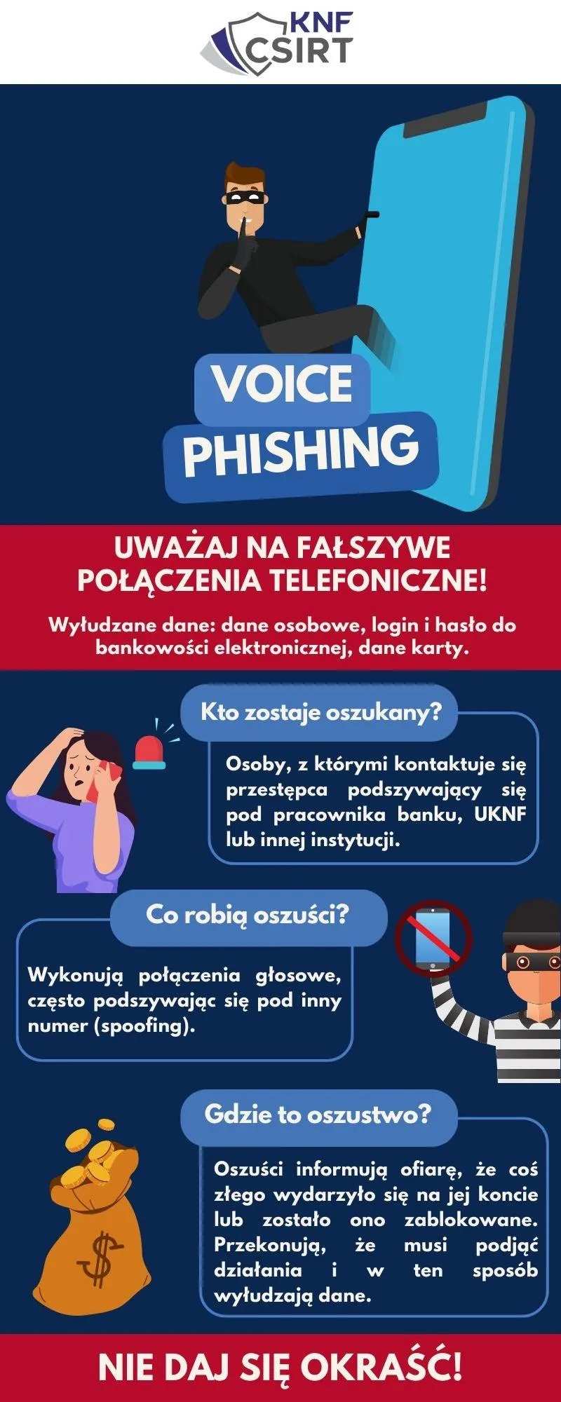 Zazwyczaj, jak tłumaczy Komisja Nadzoru Finansowego, oszuści podszywają się pod pracowników infolinii banku, instytucji państwowej lub organów ścigania „w celu wyłudzenia danych i nakłonienia swojego rozmówcy do wykonania określonych czynności”.