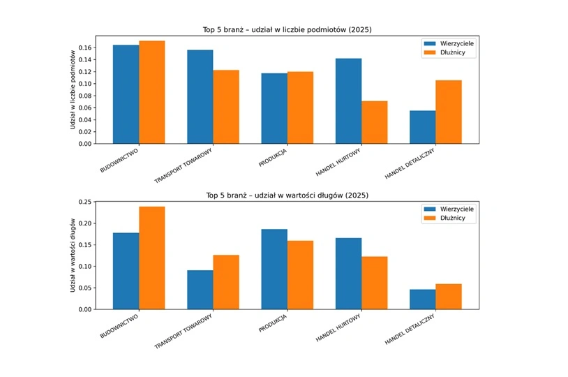 Zależność jest wyraźna: tam, gdzie przedsiębiorcy najczęściej powierzają firmom windykacyjnym odzyskiwanie należności, równie często sami mają zobowiązania wobec kontrahentów. W branżach odpowiedzialnych za największe przepływy finansowe od inwestycji budowlanych przez produkcję i handel hurtowy po transport kumuluje się największe ryzyko zatorów płatniczych.