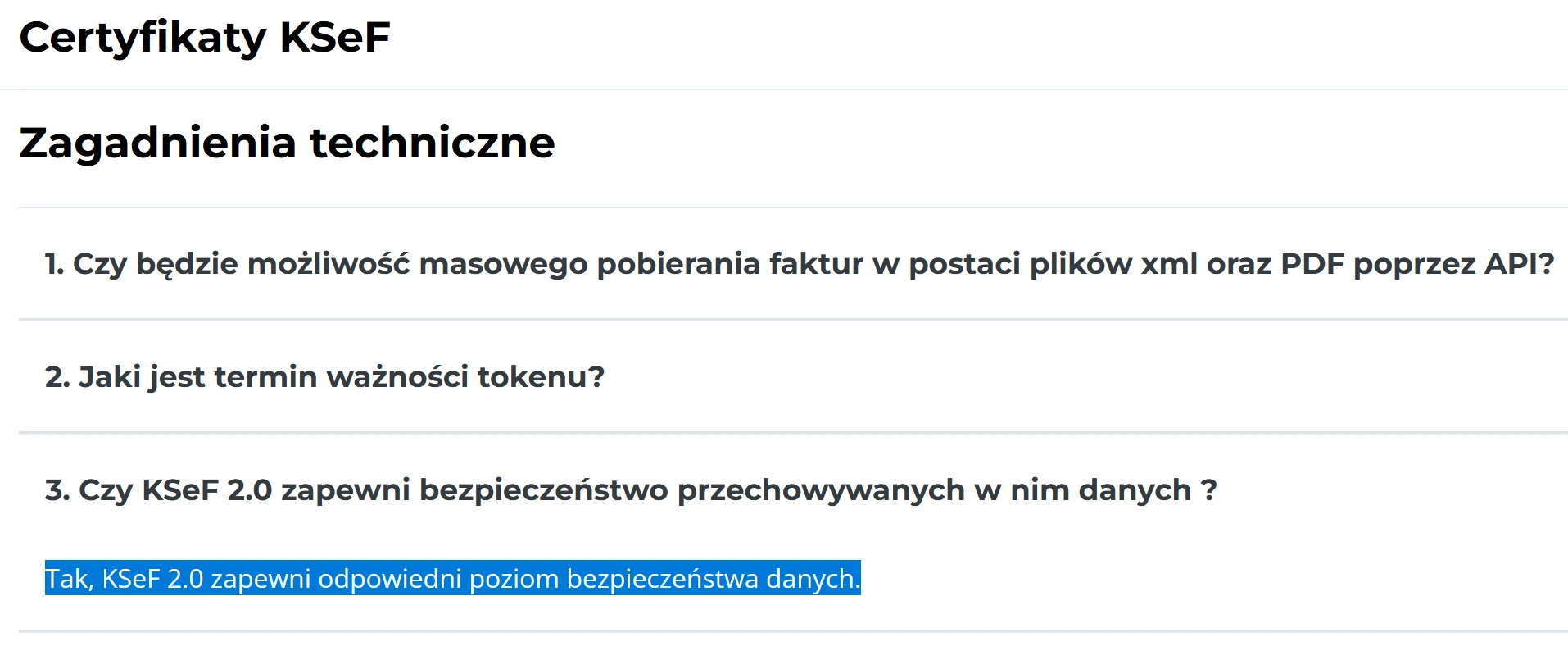 Problem polega na tym, że Ministerstwo Finansów każe nam wierzyć na słowo, zapewniając, że system jest całkowicie bezpieczny i nikt niepowołany nie będzie mieć wglądu w faktury. To przyjmuje czasem wręcz kuriozalną formę. Na stronie informacyjnej o KSeF-ie w sekcji „najczęściej zadawane pytania” odpowiedzią na pytanie, czy system będzie bezpieczny, jest po prostu „tak”: