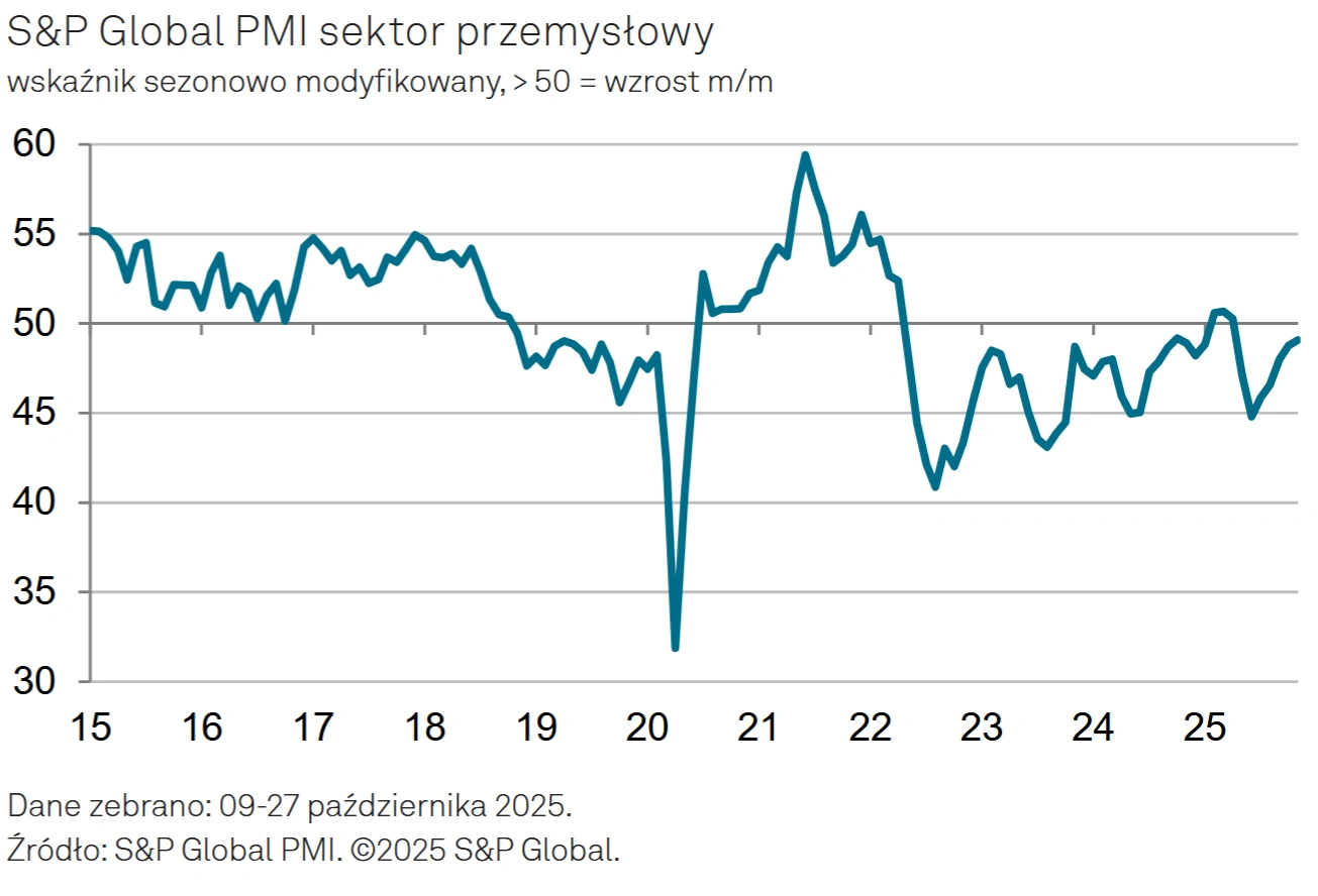 Polski przemysł nadal pracuje poniżej pełnych obrotów, ale w najnowszym odczycie S&P Global PMI widać wyraźne spowolnienie negatywnych tendencji. Badanie pokazuje, że warunki w sektorze wytwórczym wciąż są trudne, ale skala pogorszenia maleje. Indeks wzrósł w październiku z 48,0 do 48,8 pkt – do najwyższego poziomu od kwietnia. To nadal wynik sygnalizujący kurczenie się aktywności, ale znacznie łagodniejszy niż latem.