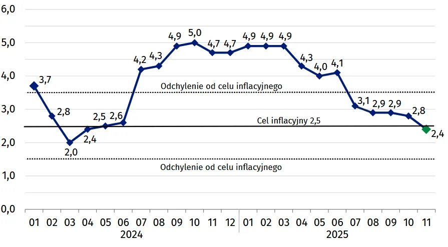 2,4 proc. r/r to odczyt wyraźnie niższy od październikowego (2,8 proc.) i minimalnie poniżej celu Narodowego Banku Polskiego (2,5 proc.). Jednym słowem: ten odczyt to pozytywne zaskoczenie.