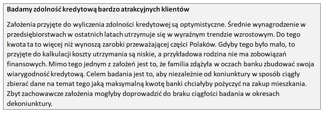 I dodaje, że ING i PKO zapytane w listopadzie o maksymalny kredyt, na który mogłaby liczyć trzyosobowa rodzina z dochodem na poziomie dwóch średnich krajowych, zbliżyły się już ze swoimi deklaracjami do sumy 1 mln zł. Nawet banki kalkulujące zdolność kredytową w sposób bardziej zachowawczy i tak proponują rodzinie z omawianego przykładu pożyczenie na zakup mieszkania około 850 tys.