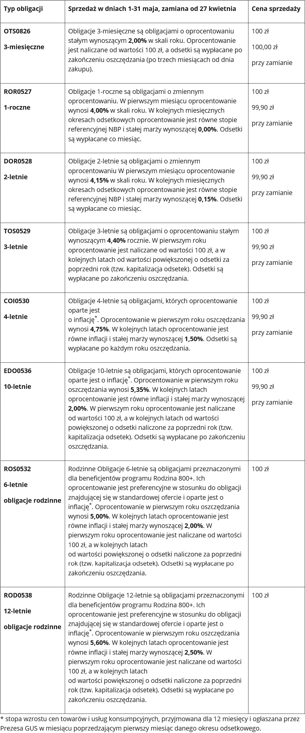 Ministerstwo Finansów podaje, że w maju oprocentowanie 1-rocznych o zmiennym oprocentowaniu opartym o stopę referencyjną NBP wyniesie 4 proc., a 2-letnich 4,15 proc. w pierwszym miesięcznym okresie odsetkowym. Oprocentowanie obligacji stałoprocentowych 3-miesięcznych wynosić będzie 2 proc. w skali roku, a 3-letnich 4,4 proc.