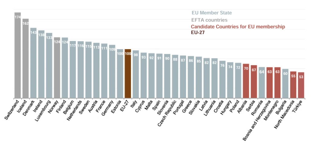 „W 2024 r. Luksemburg i Irlandia odnotowały najwyższe poziomy PKB na mieszkańca w UE, odpowiednio o 145 proc. i 121 proc. powyżej średniej UE” – informują statystycy Eurostatu.