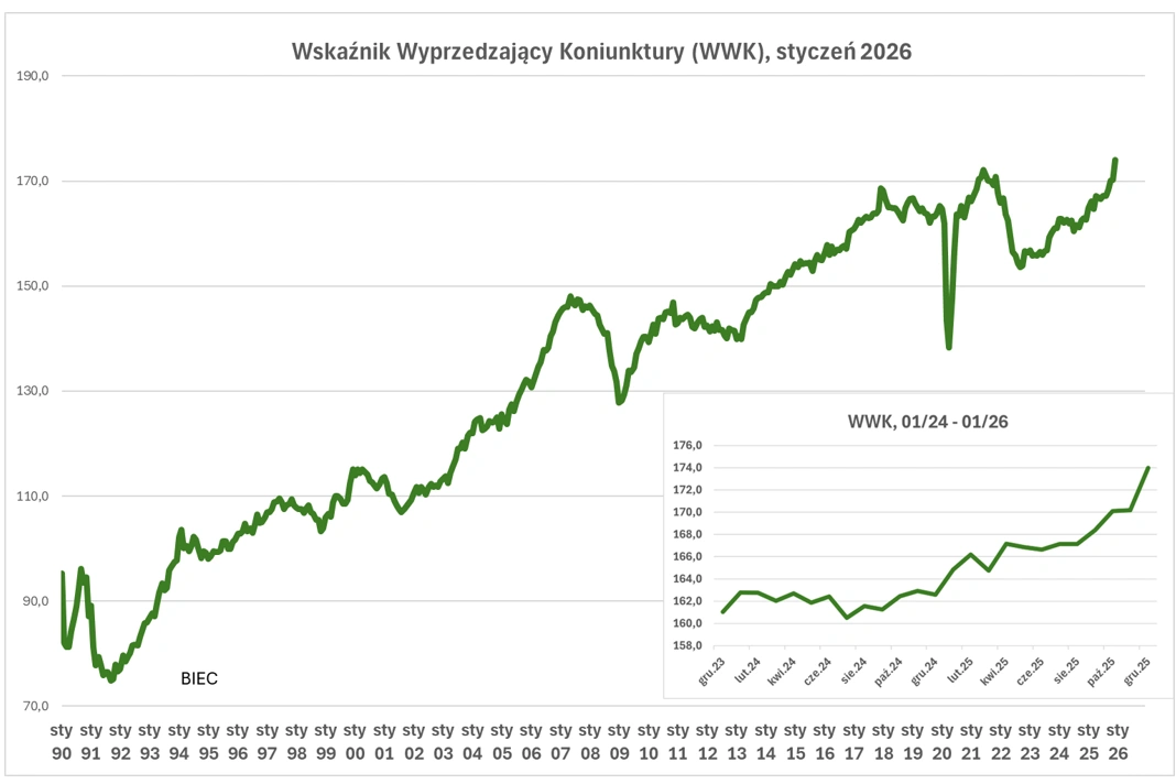 Wskaźnik Wyprzedzający Koniunktury (WWK), informujący z wyprzedzeniem o przyszłych tendencjach w gospodarce w styczniu 2026 roku ponownie wzrósł znacząco (o 3,8 punktu) w stosunku do swych wartości sprzed miesiąca – wskazuje BIEC.