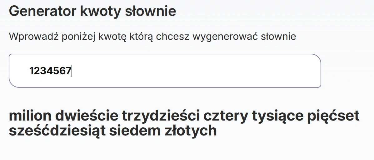 Wśród narzędzi dostępny jest nawet... generator kwoty słownie. Wpisujemy interesującą nas kwotę wyrażoną liczbowo, a po wciśnięciu klawisza „enter” uzyskamy kwotę słownie. Rozwiązanie to ma zastosowanie przede wszystkim w przypadku, wysokich, trudnych kwot – na przykład: