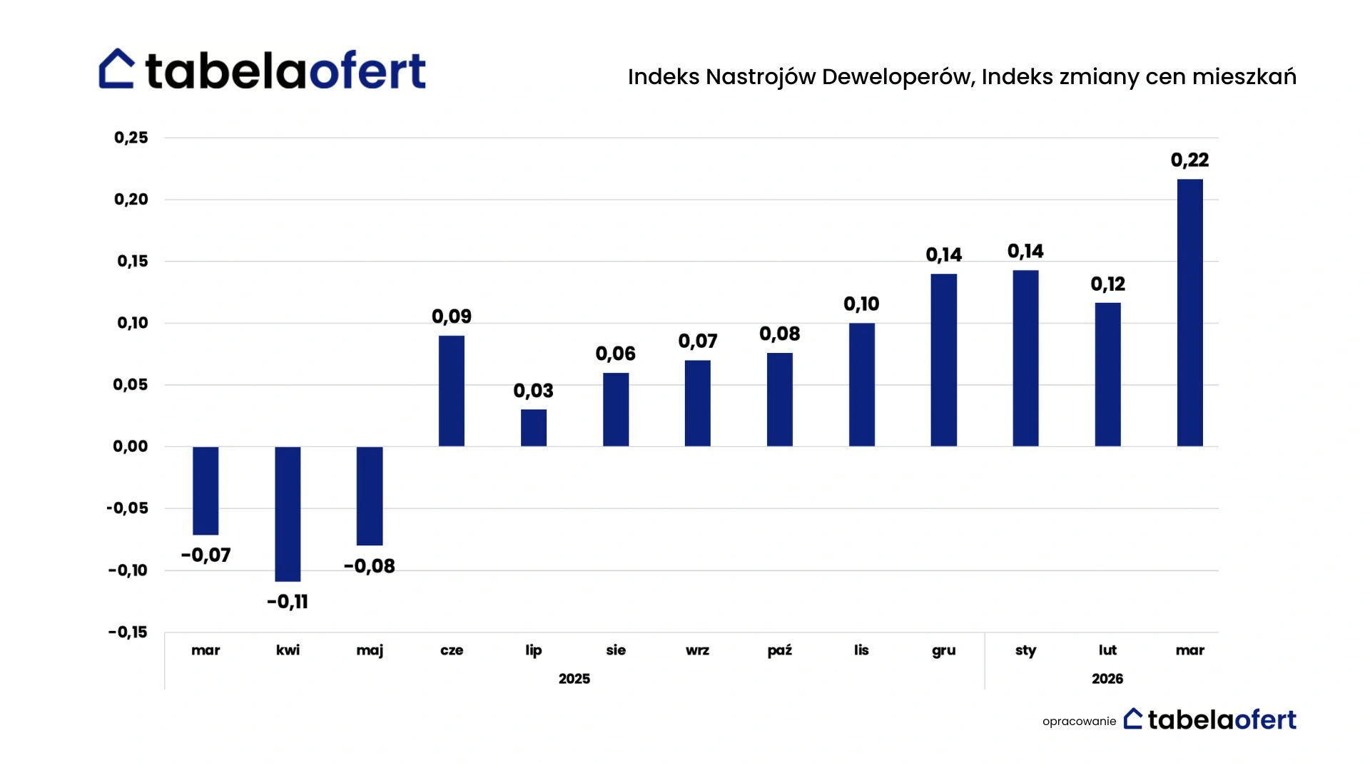 W marcu wyraźnie wzrósł także Indeks Zmiany Cen Mieszkań z 0,12 do 0,22, osiągając najwyższy poziom w całym analizowanym rocznym okresie.