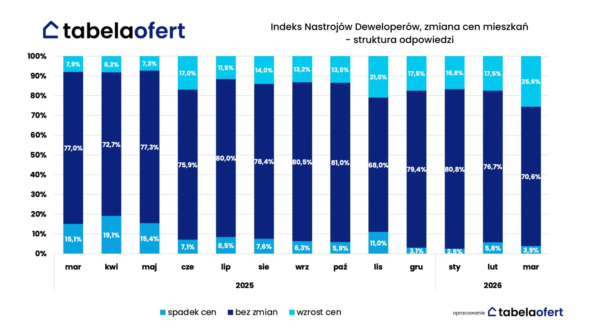 To według ekspertów efekt rosnącego udziału deweloperów zakładających podwyżki cen: w marcu było ich już 25,6 proc., wobec 17,5 proc. miesiąc wcześniej. Jednocześnie zmniejszył się odsetek firm spodziewających się spadków cen z 5,8 proc. do 3,9 proc., a nadal dominującą odpowiedzią pozostaje stabilizacja cen.