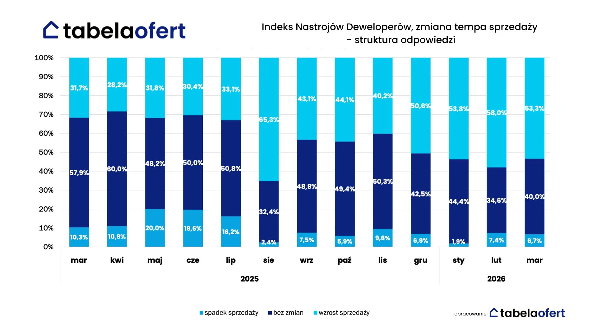 Marcowy Indeks Nastrojów Deweloperów portalu Tabelaofert.pl pokazuje, że choć rynek pozostaje stabilny, to po bardzo mocnym początku roku popyt nieco wyhamował, a rosnące koszty realizacji inwestycji coraz wyraźniej wzmacniają presję na podwyżki w nowych projektach.