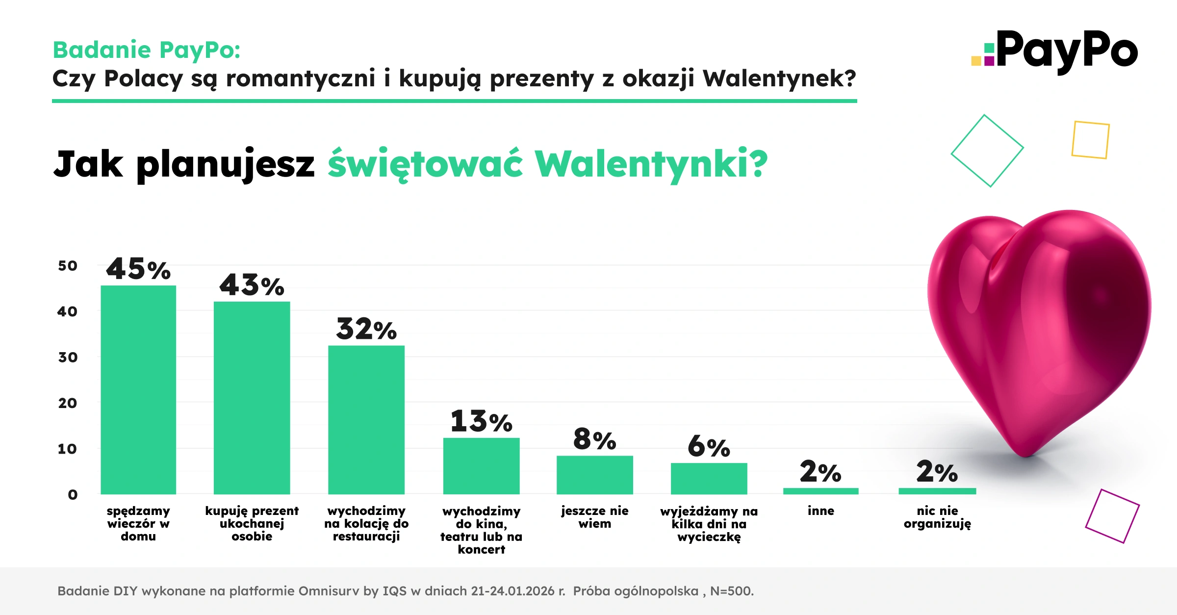 Najczęściej wybieranym scenariuszem walentynkowym jest spędzenie wieczoru w domu - takie plany ma 45 proc. respondentów. Jednocześnie 43 proc. badanych planuje kupić prezent ukochanej osobie, a 32 proc. wyjść na kolację do restauracji.
