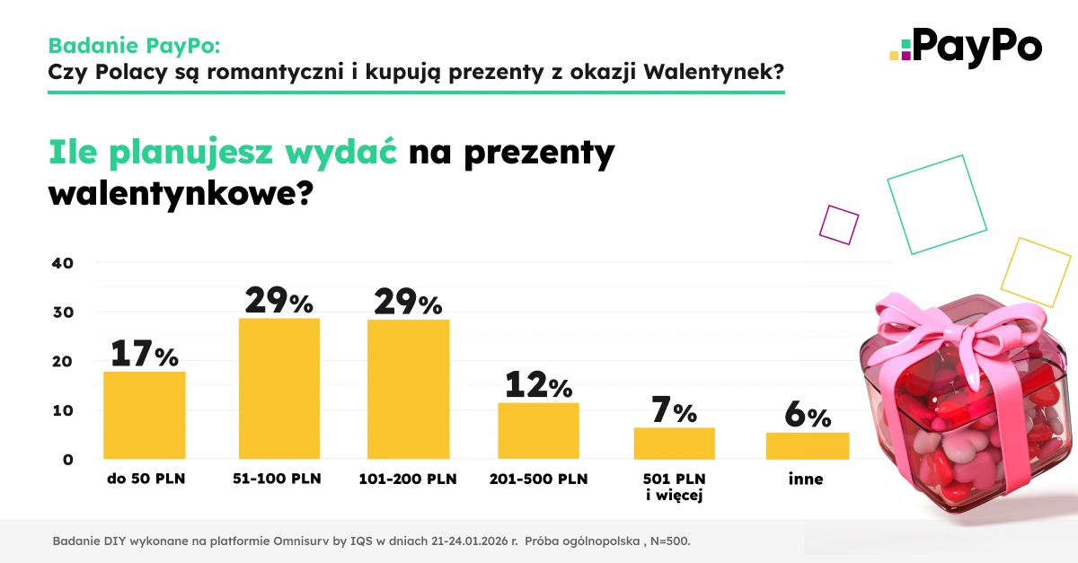 Deklaracje respondentów badania PayPo pokazują, że walentynkowe wydatki w 2026 roku pozostaną racjonalne i dalekie od zakupowego szaleństwa. Najwięcej badanych - po 29 proc. planuje wydać od 51 do 100 zł lub od 101 do 200 zł, co jasno wskazuje, że to właśnie ten przedział stanowi dziś standardowy budżet walentynkowy.