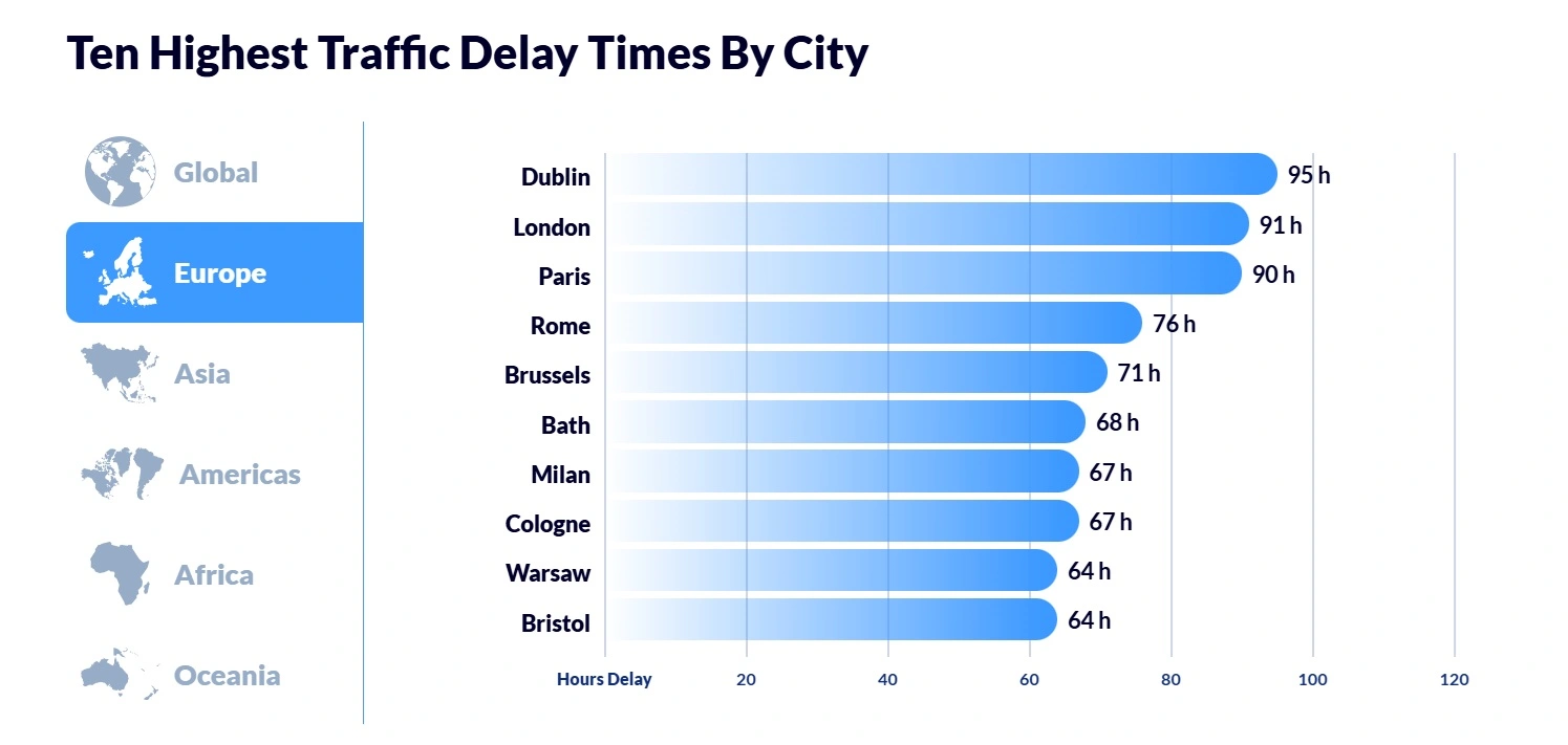 Spośród europejskich miast najbardziej zakorkowanym okrzyknięto Dublin (94 godzin w korkach), dalej Londyn i Paryż.