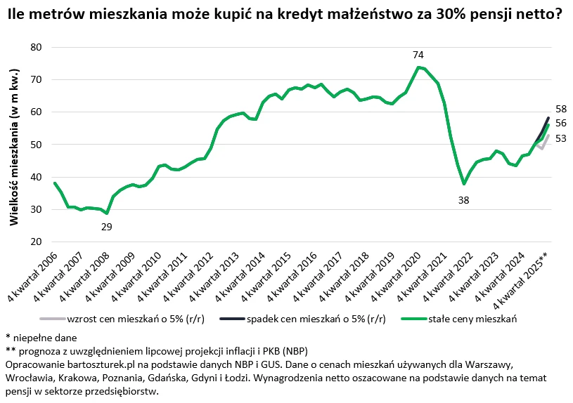 Turek wskazuje, że jeszcze w trzecim kwartale 2022 roku przykładowa para mogłaby kupić tylko 38 mkw. Był to jednak okres, w którym o kredyt mieszkaniowy było bardzo trudno, a rząd, aby ulżyć kredytobiorcom, uruchomił wakacje kredytowe. Mówiąc wprost - mało kogo stać było na kredyt, a nawet para dysponująca dwiema średnimi krajowymi była w stanie zadłużyć się na bardzo skromne lokum.