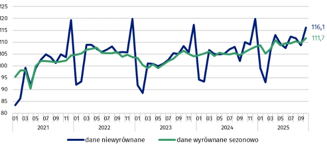 Po odsezonowaniu sprzedaż wyrównana sezonowo wzrosła r/r o 5,6 proc. W całym okresie styczeń–październik 2025 r. konsumpcja zwiększyła się o 4,3 proc. w porównaniu z analogicznym okresem 2024 r.