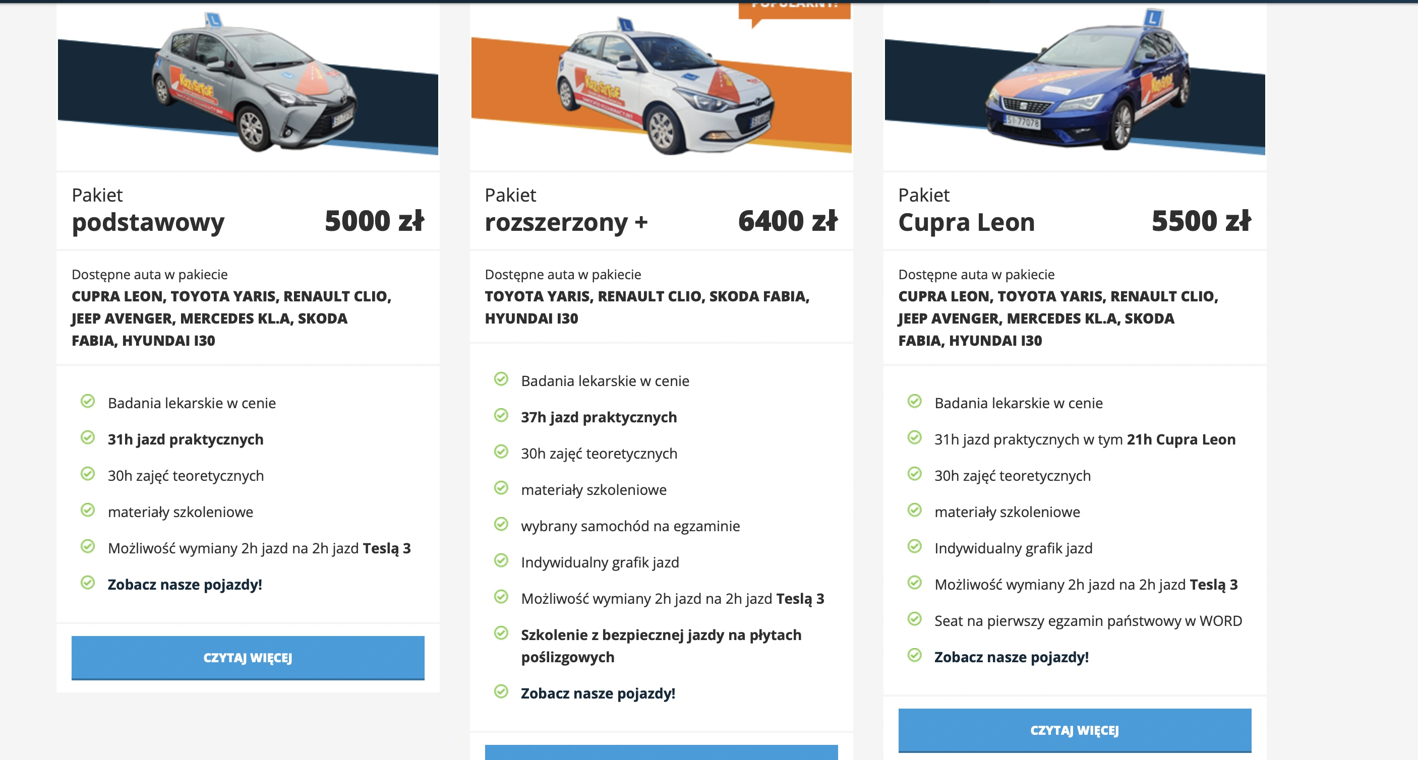 I to jest najtańsza opcja dla przyszłych kierowców. Są jeszcze do wyboru dwa pakiety. Jeden za 5500 zł: w tym przypadku godzin jazd jest tyle samo, tyle tylko, że 21 z nich jest zorganizowanych z samochodzie modelu Cupra Leon i stąd dopłata 500 zł. Trzecia opcja jest najdroższa: to wydatek 6400 zł. Tutaj mamy już więcej jazd, bo 37 godzin i dochodzi szkolenie na płytach poślizgowych. Dostępne są trzy formy płatności: całość gotówką, w trzech ratach 0 proc. 1500 zł i dwa razy 1750 zł (ale dotyczy to tylko tego najtańszego kursu) albo rozłożenie płatności na raty kredytu bankowego z normalnymi odsetkami.