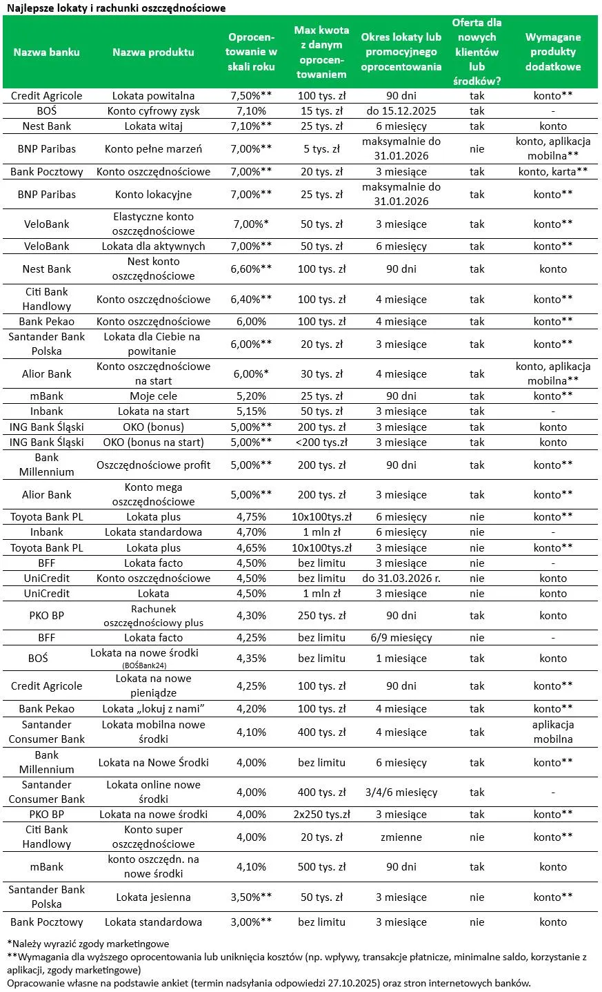 Większość z tych ofert wymaga założenia konta osobistego, korzystania z aplikacji lub wyrażenia zgód marketingowych. W przypadku depozytów bez dodatkowych wymagań oprocentowanie spada do około 4-4,5 proc.