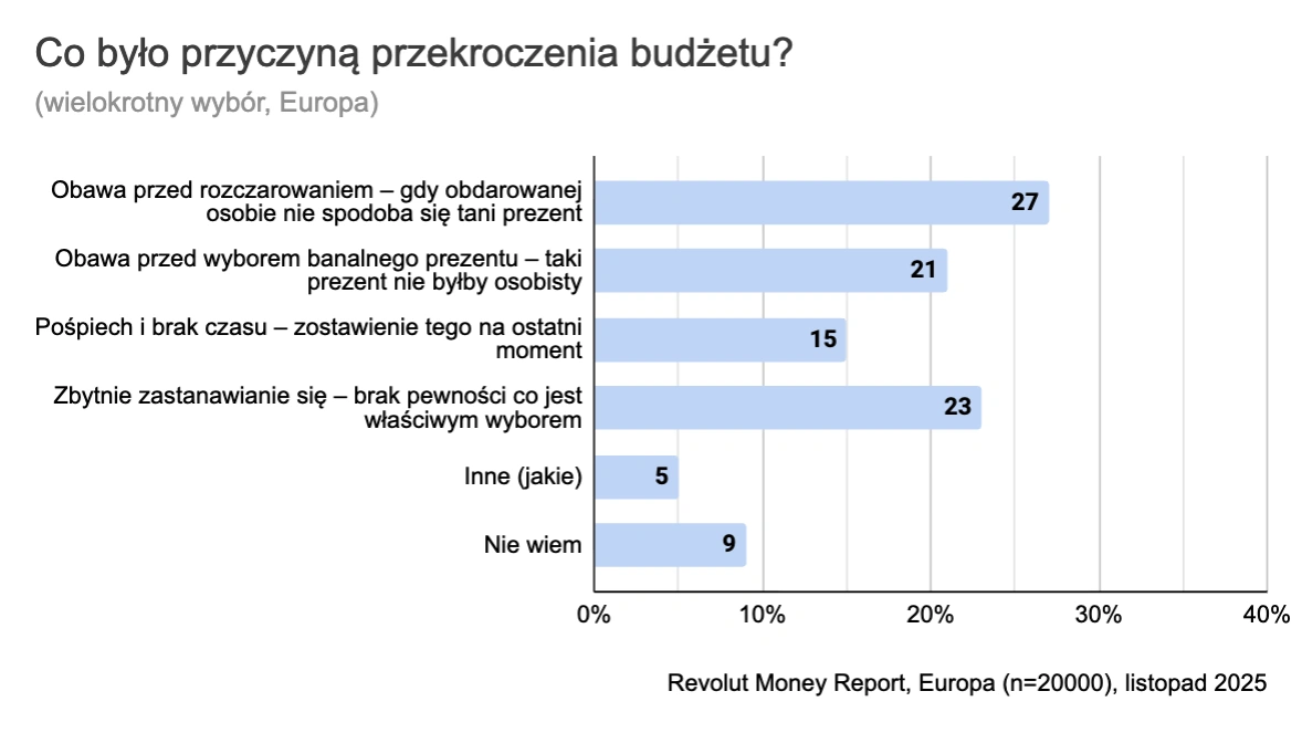 Choć większość uczestników deklaruje, że dawanie prezentów sprawia im radość (41 proc. Polaków), nie brakuje głosów sprzeciwu. Co piąty badany w Polsce (21 proc.) przyznaje szczerze: wybieranie komuś prezentu go nie interesuje, nie widzi sensu w wydawaniu pieniędzy lub bierze udział tylko z uwagi na presję społeczną.
