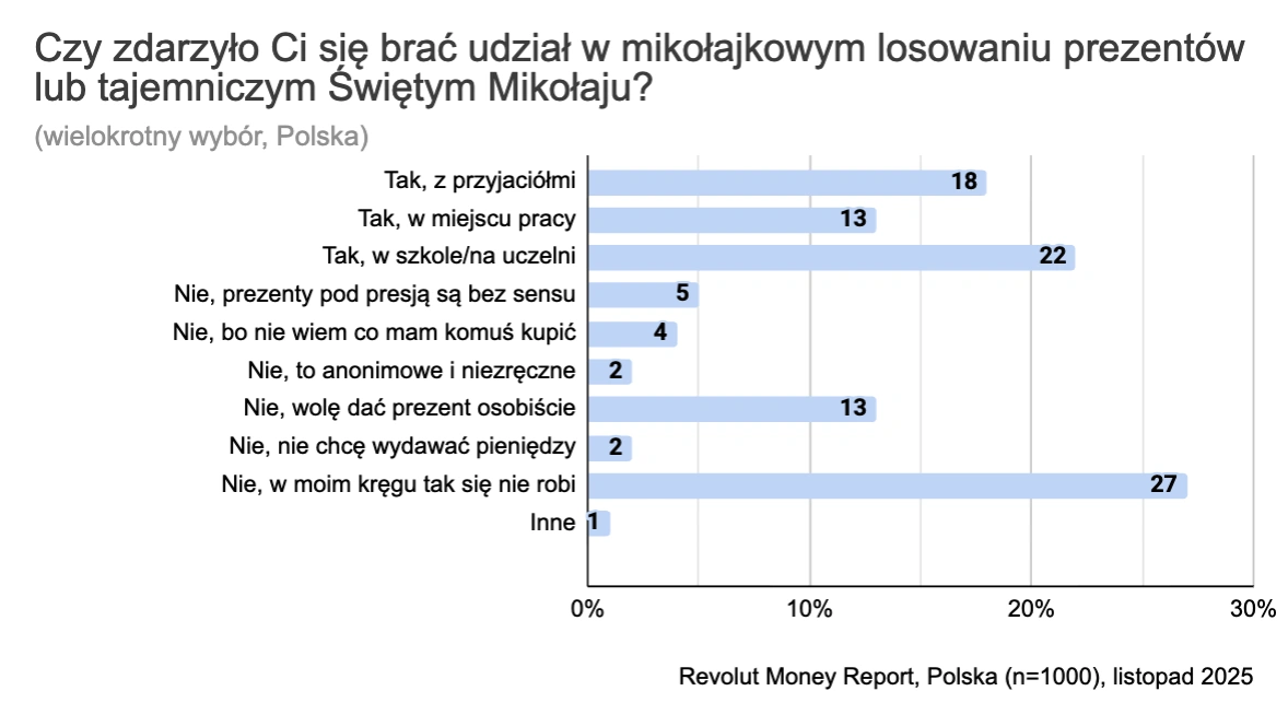 Co drugi Polak (47 proc.) miał okazję uczestniczyć w tej mikołajkowej zabawie, ale to przede wszystkim młodzi ludzie: w szkołach i na uczelniach tradycja ta jest najpopularniejsza w całej Europie (22 proc.). W miejscach pracy czy w gronie przyjaciół secret santa pojawia się znacznie rzadziej.