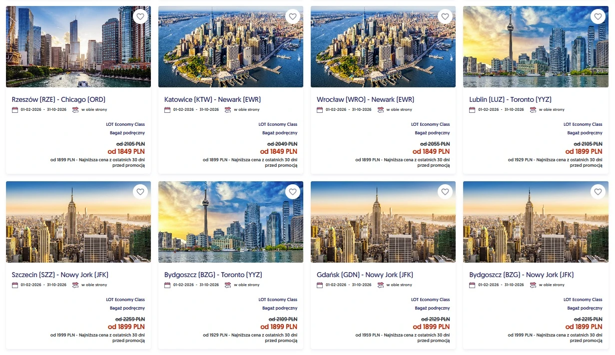 Sprawdźmy, jak wyglądają te mega ceny biletów lotniczych LOT. W Polskę ruszymy już od 89 zł. Z kolei do Ameryki Północnej można polecieć poniżej 1900 zł w obie strony. Z wielu polskich miast możemy udać się na lotnisko Chicago lub Newark od 1849 zł. Z kolei Toronto kusi ceną od 1899 zł, podobnie jak Nowy Jork.