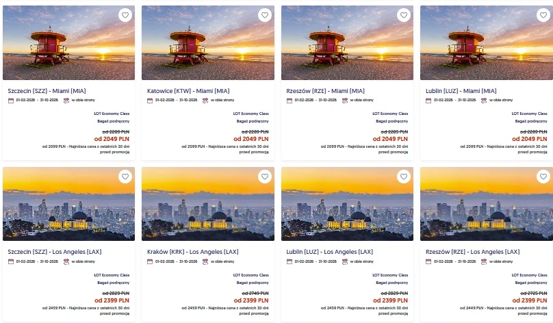 Zachodnie wybrzeże USA kosztuje nie wiele drożej - do Miamy ceny biletów zaczynają się od 2049 zł, natomiast Los Angeles od 2399 zł.