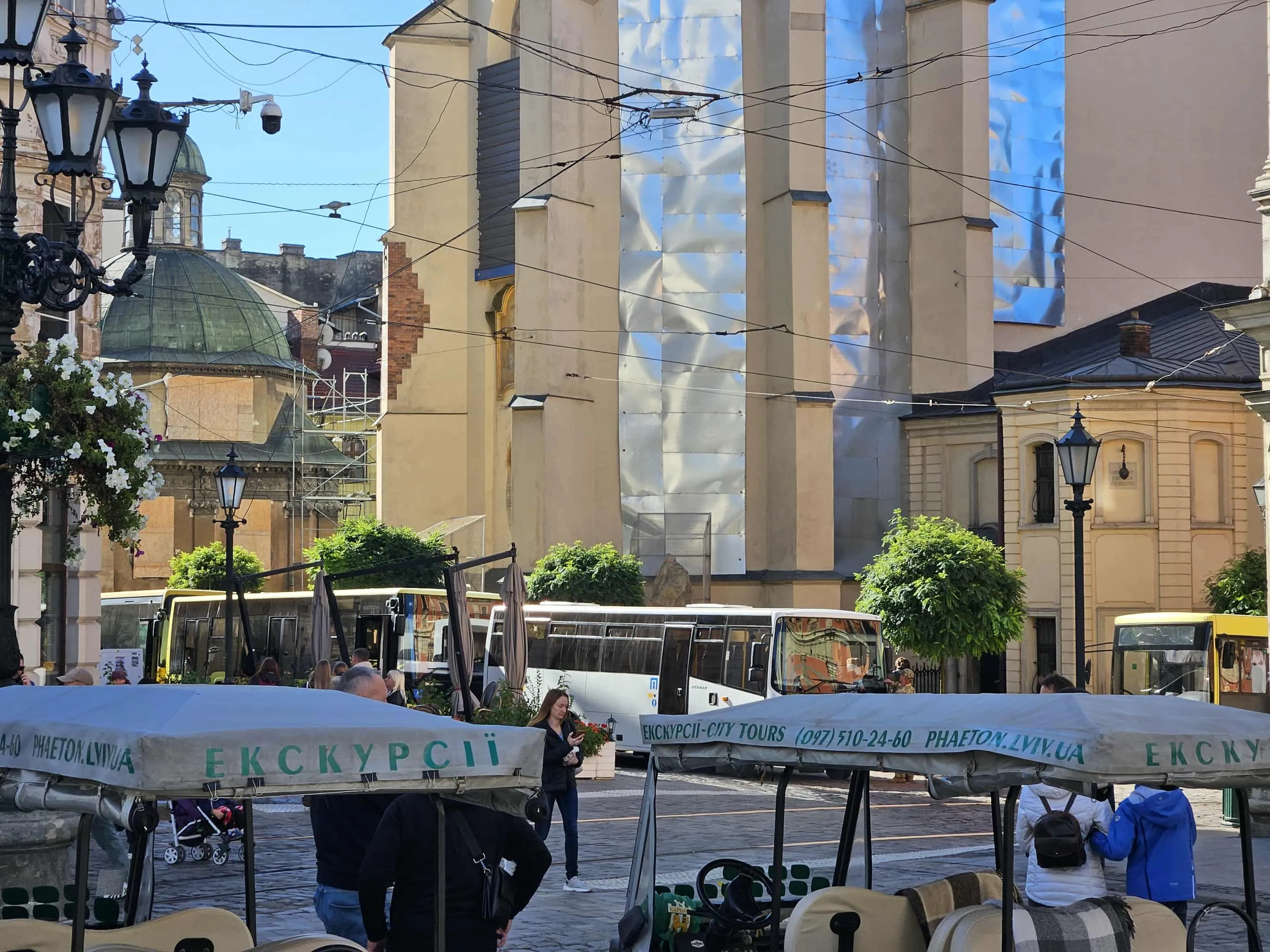 Pierwszego dnia we Lwowie robię zdjęcie, które najlepiej oddaje absurd ukraińskiej codzienności. Na pierwszym planie - kolorowe meleksy dla turystów. W tle - kościół z oknami zasłoniętymi blachą przed odłamkami rakiet. Pomiędzy nimi stoją autobusy wojskowe. Dziś jest ceremonia pogrzebowa trzech poległych żołnierzy.