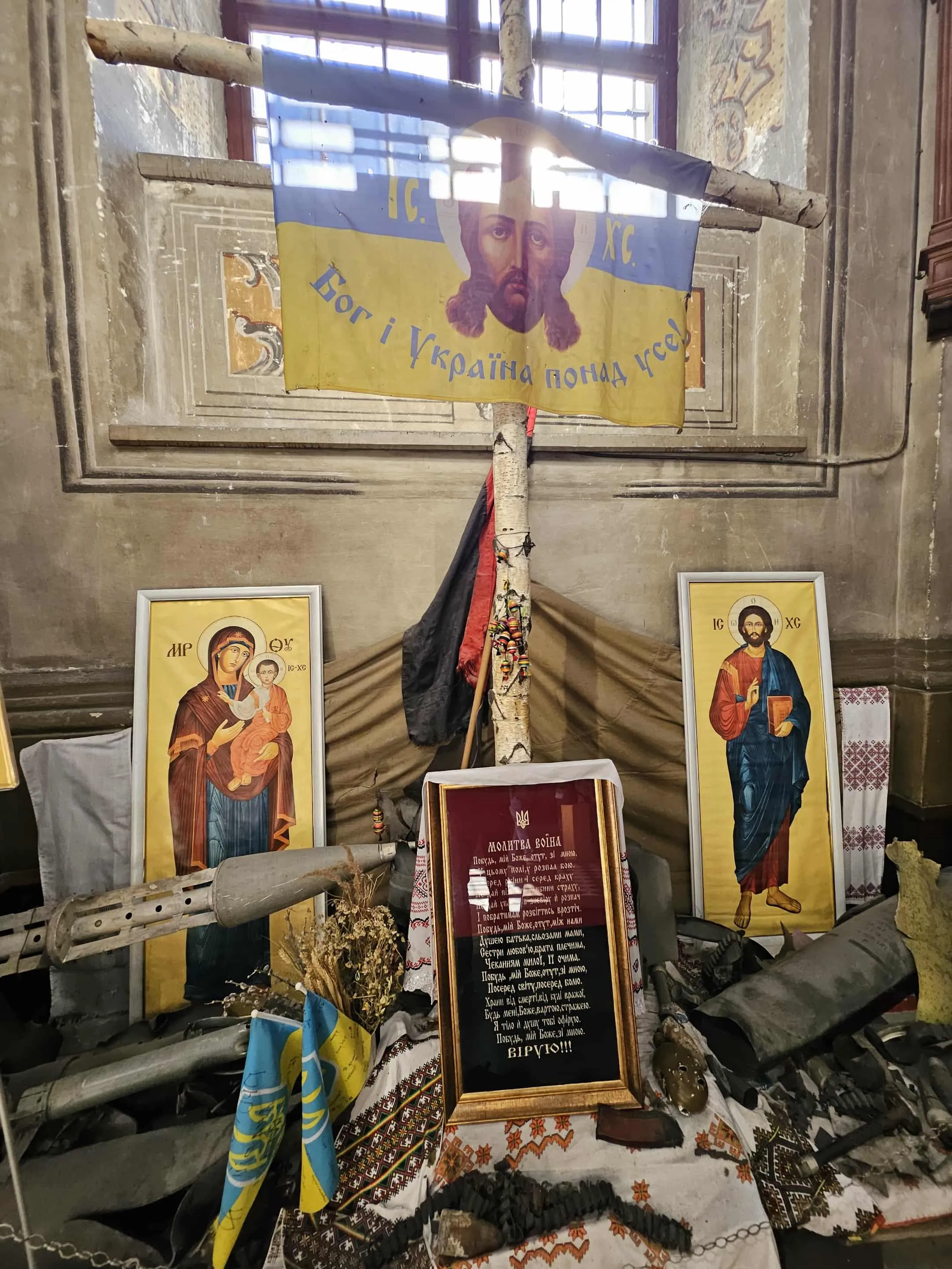Następnego dnia odwiedzam greckokatolicki kościół wojskowy. Obok wizerunków poległych wisi brzozowy krzyż przywieziony z frontu i łuski po nabojach.