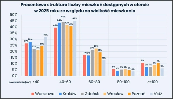 Zmiany struktury podaży widoczne były także w mniejszych miastach. Analiza danych dla dziesięciu rynków regionalnych pokazała, że w 2025 roku lokale do 60 mkw. stanowiły około 67 proc. wszystkich ofert. Jednocześnie zwiększył się udział największych mieszkań o powierzchni powyżej 100 mkw.