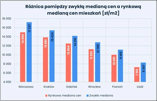 Według szacunków różnica ta wynosiła od 11 proc. w Poznaniu i Krakowie do 15 proc. w Warszawie, a w przypadku Łodzi, Gdańska i Wrocławia około 14 proc. W wymiarze nominalnym oznaczało to na przykład około 2,2 tys. zł różnicy na metrze kwadratowym w Warszawie i niespełna 1 tys. zł w Łodzi.