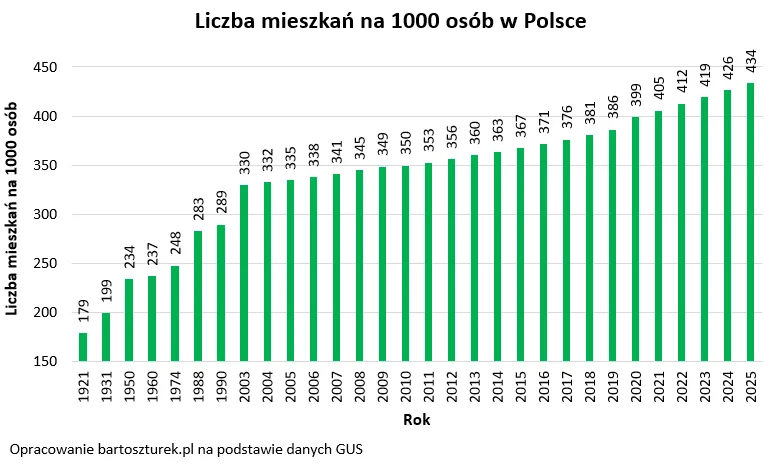 Polska mieszkaniówka osiągnęła poziom, który jeszcze kilkadziesiąt lat temu był nie do pomyślenia. Na każdy tysiąc mieszkańców przypada dziś niemal 434 mieszkania i domy – szacuje analityk Bartosz Turek. To ponad dwa razy więcej niż po II wojnie światowej i niemal o 100 lokali więcej niż dwie dekady temu. Dane pokazują cywilizacyjny skok, ale same liczby nie rozwiązują wszystkich problemów.