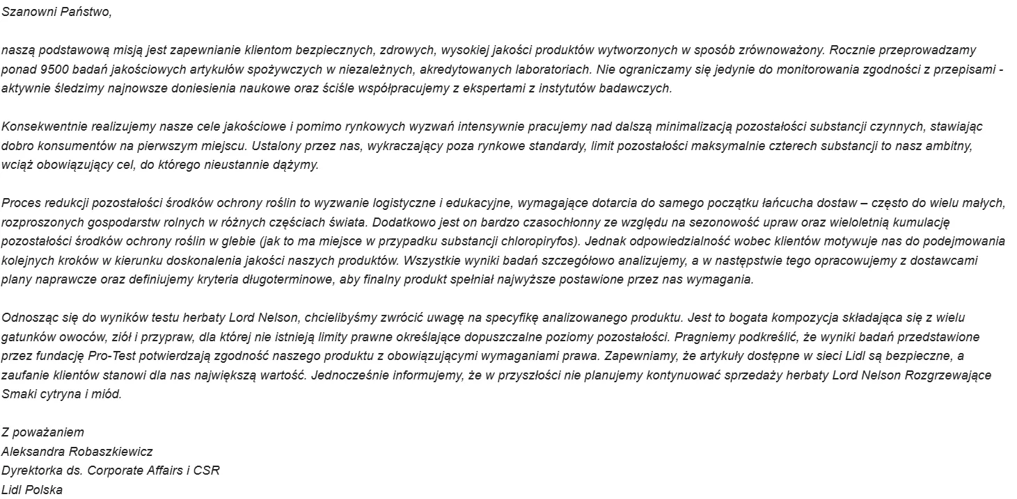 Do wyników testu po publikacji artykułu odniósł się Lidl Polska. Poniżej stanowisko sieci: