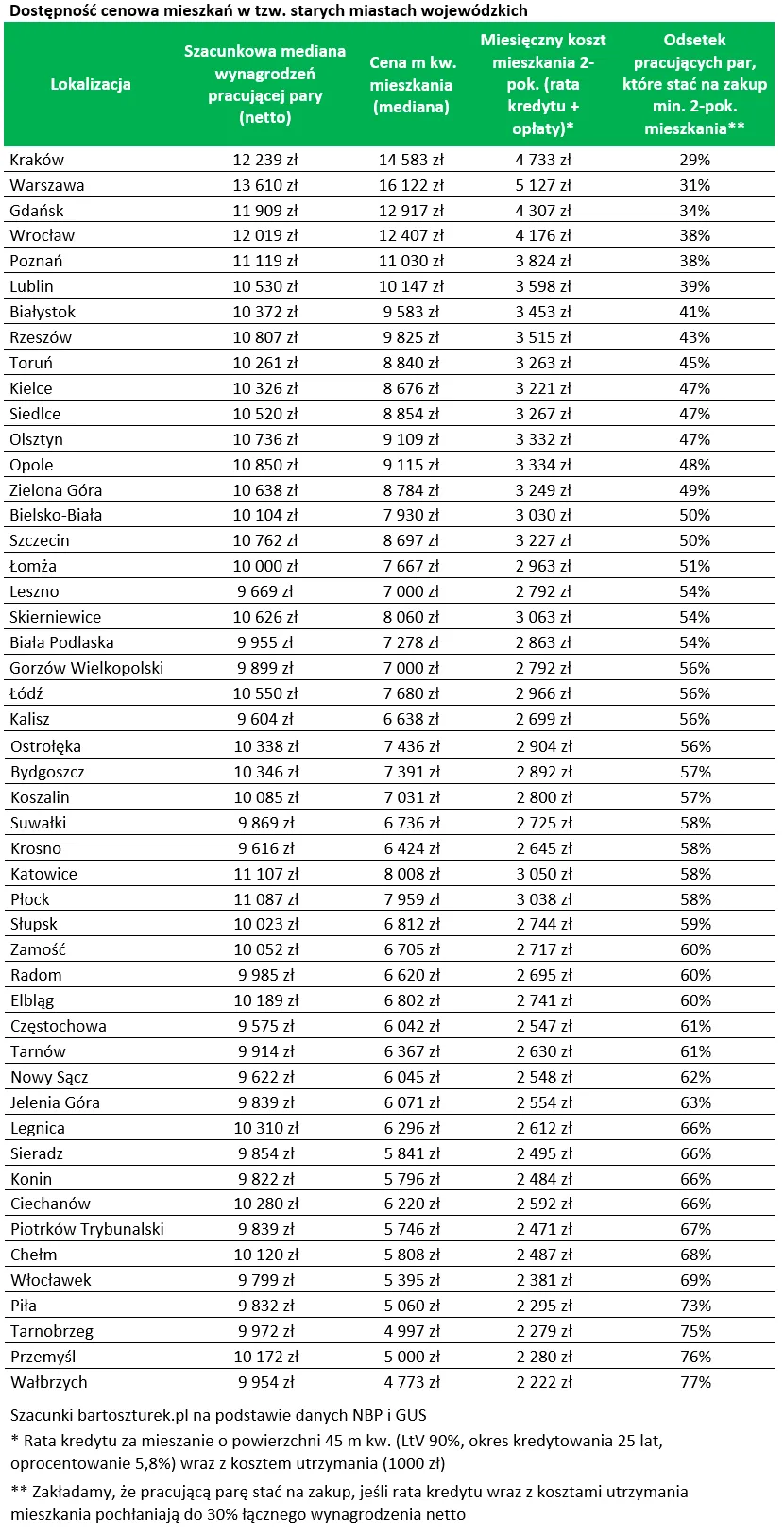 Najnowsze dane sugerują, że pod tym względem najlepsza sytuacja panuje w Wałbrzychu, Przemyślu, Tarnobrzegu i Pile. W tych miastach nawet ponad 70 proc. pracujących par mogłoby sobie pozwolić na zakup na kredyt co najmniej 45-metrowego lokum. Zarobki w tych lokalizacjach są oczywiście niższe niż w największych miastach, ale różnica nie jest aż tak duża, jak różnica w poziomie cen mieszkań.