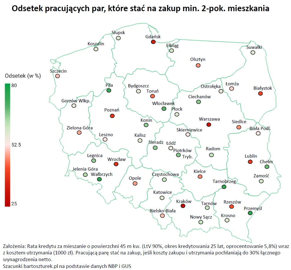 Bartosz Turek, analityk rynku nieruchomości wskazuje, że już ponad 45 proc. pracujących par może kupić z pomocą kredytu co najmniej dwupokojowe mieszkanie. Szacunki przygotowane na podstawie danych NBP i GUS obejmują 49 dawnych miast wojewódzkich i zostały zważone liczbą mieszkańców.