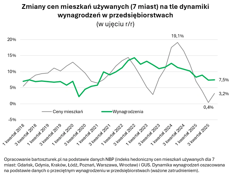 I dodaje, że w stolicy ponad połowa mieszkań kosztowała co najmniej 16 tys. zł za metr, a w Wałbrzychu ponad połowa lokali została sprzedana za mniej niż 5 tys. zł za metr kwadratowy (dane GUS za 3 kwartał 2025 roku). Bardzo podobnie sytuacja wyglądała w Pile, Tarnobrzegu, Przemyślu czy Włocławku.