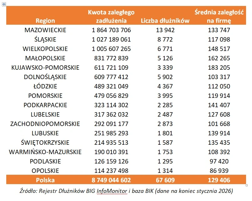Wysokie zaległości notują także Śląsk i Wielkopolska po ponad 1 mld zł, gdzie liczba niesolidnych podmiotów przekracza odpowiednio 8,7 tys. i 6,7 tys. przedsiębiorstw. Wyróżnia się też woj. kujawsko-pomorskie, gdzie średnia kwota zaległości przypadająca na jeden podmiot jest najwyższa i przekracza 183 tys. zł, co wskazuje na większą skalę problemu w pojedynczych przedsiębiorstwach.